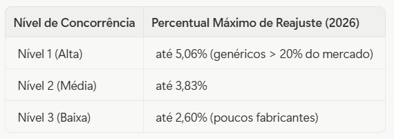 Para 2026, a CMED divulgou os percentuais máximos de reajuste, que variam conforme o nível de concorrência de cada medicamento. Conheça seus adversários: